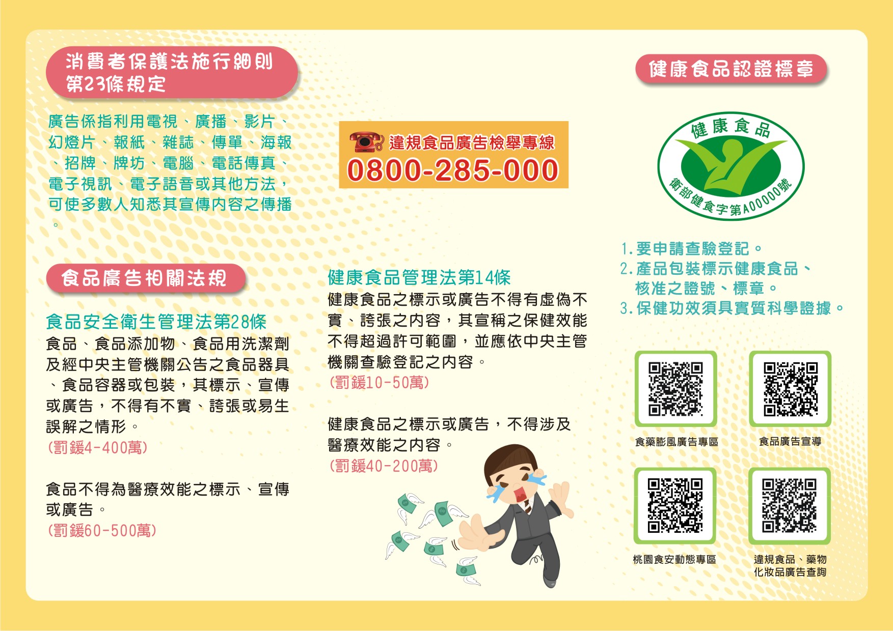 食品廣告:食品到消費者手上需靠食品廣告行銷,才能引起消費者購買慾望,而食品廣告審查的目的是為了保護消費者權益,防止食品廣告不實、誇張或易生誤解,或宣稱有醫療效能,影響消費者的健康與選擇。